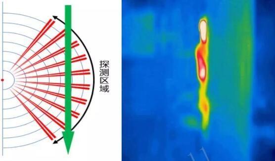 但由于菲涅尔透镜的原因,能够聚焦和划分明暗空间,所以实际使用上正确的触发方式是人体切割射线区域(如下图红色区域)。笔直超向探测器行走,可能会发生漏报(无法切割红色区域)。